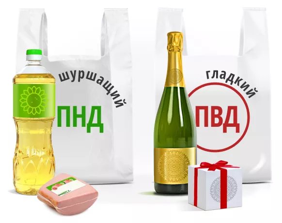 | Гладкий глянцевый пакет — ПВД пакет «майка» изготовлен из полиэтилена высокого давления. Устойчив к порезам и проколам, эластичен, но по сравнению с ПНД пакетами обладает меньшей грузоподъёмностью. | Пакет «майка» может быть как гладкий глянцевый, так и шуршащий матовый. Шуршащий матовый пакет — ПНД пакет «майка» изготовлен из полиэтилена низкого давления. Он выдерживает больший вес, но не устойчив к острым углам. | ||